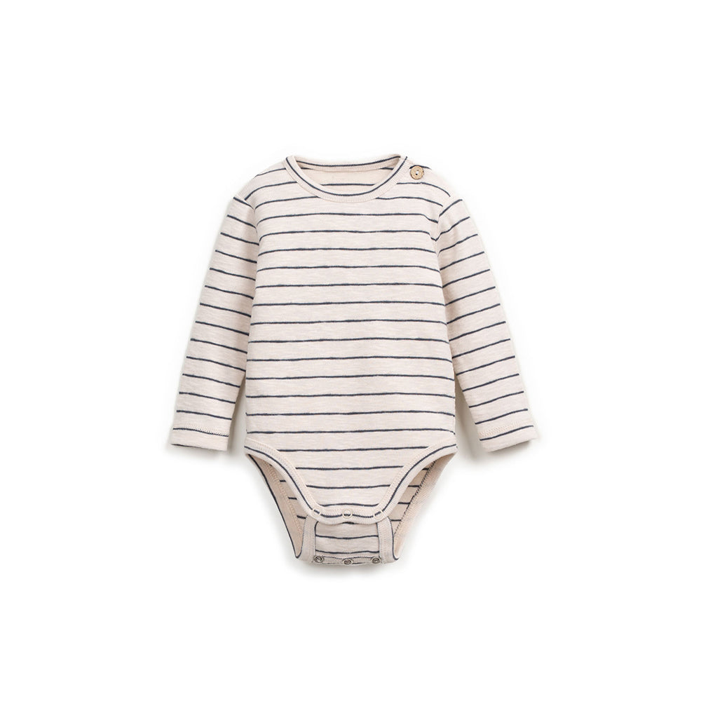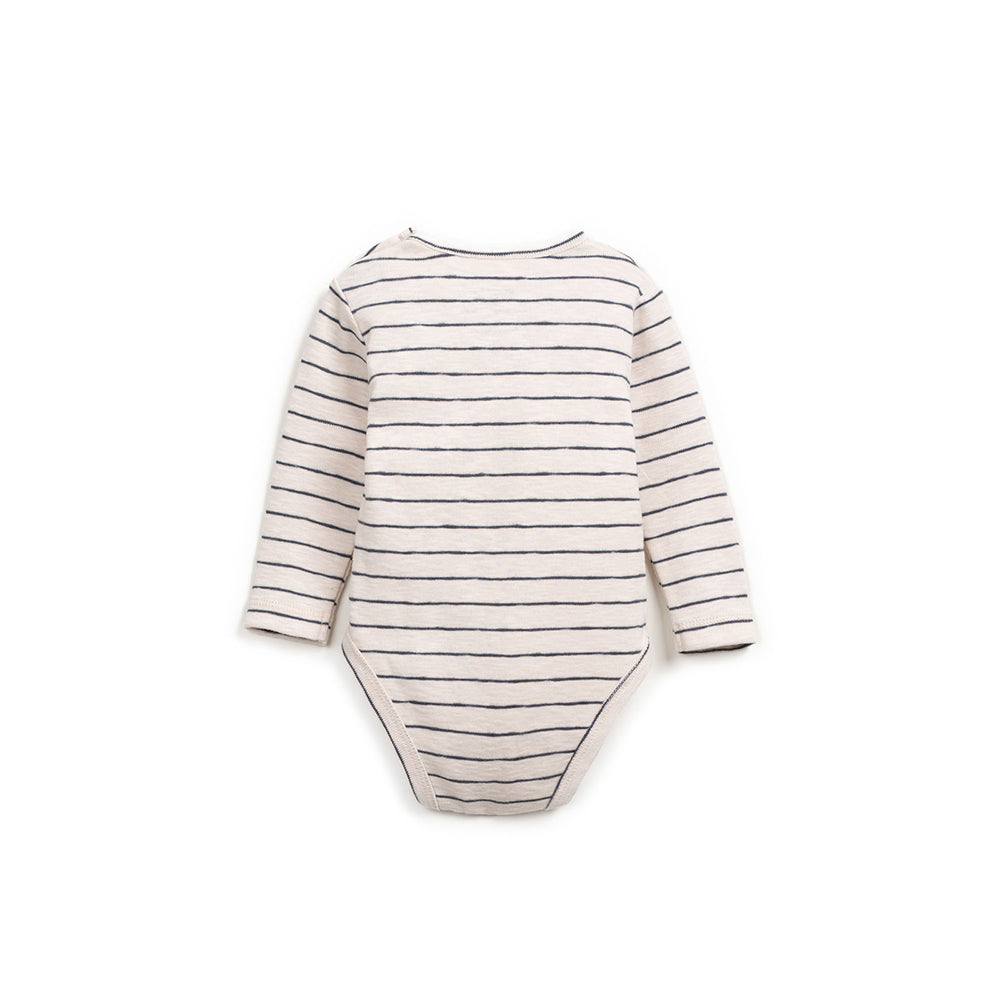 Body girocollo con maniche lunghe in jersey di cotone organico color gesso, a righe blu carta da zucchero. Effetto malfilato. Apertura sulla spalla con bottone in cocco e sul cavallo con bottoni automatici (doppia regolazione per permettere al bambino di poterlo utilizzare più a lungo). Il cotone utilizzato da Play Up è certificato GOTS (Global Organic Textile Standard). Les Bulles consiglia di indossarlo con la ghettina in abbinamento. 100% cotone organico. Made in Portogallo