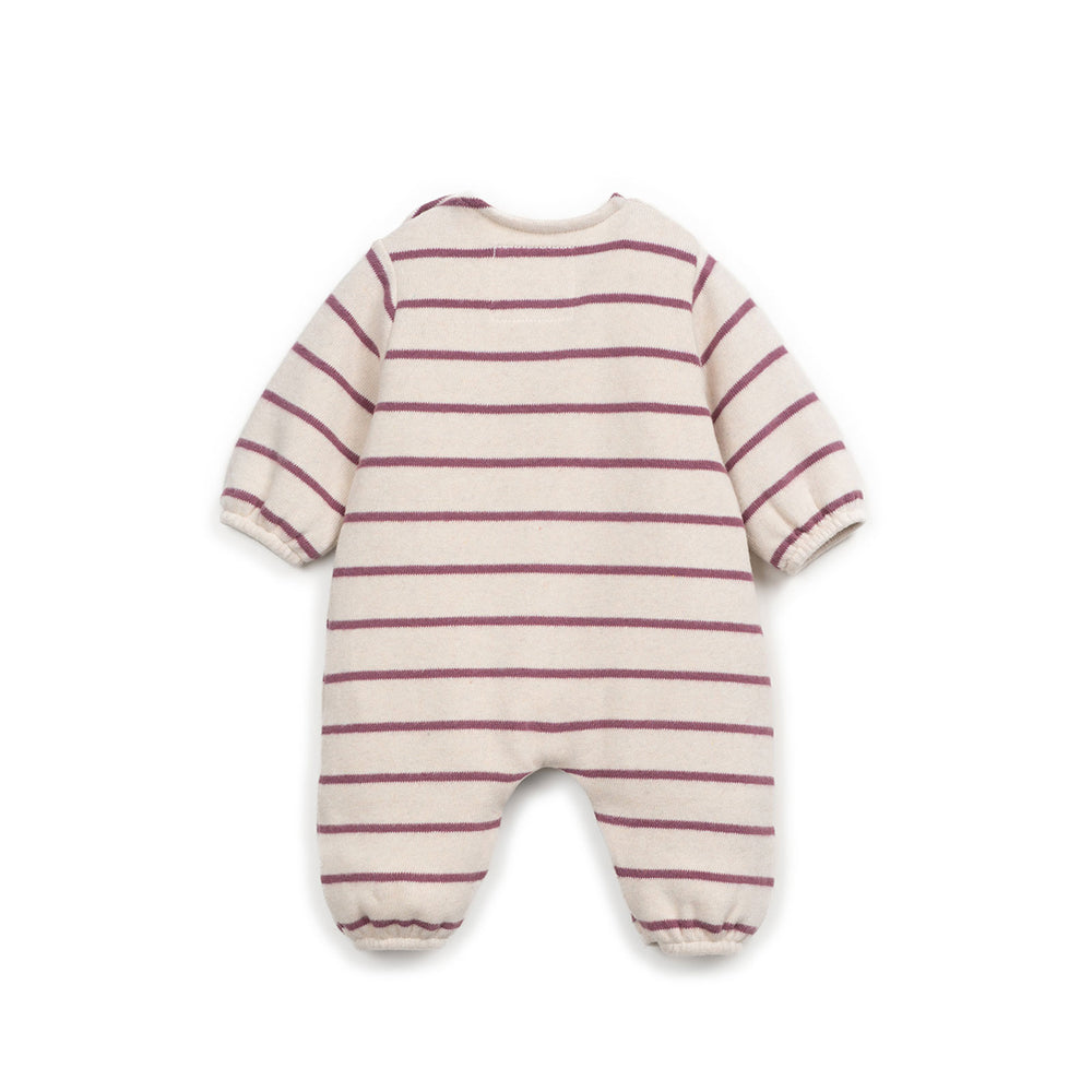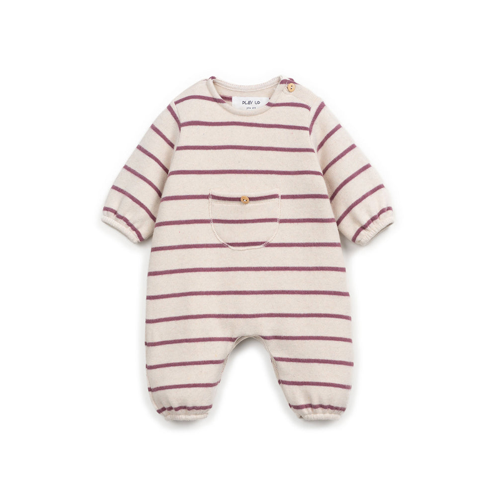 Tutina girocollo a manica lunga in morbido caldo cotone color gesso a righe bordeaux. Apertura sulla spalla con bottoncino in legno e sul cavallo con bottoni automatici a scomparsa. Tasca applicata sul davanti, con bottoncino in legno. Elastico ai polsi e alle caviglie. Play Up è un'azienda molto attenta all'ambiente e produce questa tutina con tessuto riciclato: scopri da Les Bulles tutti i prodotti con il marchio eco! 89% cotone rigenerato, 10% cotone riciclato, 1% elastane. Made in Portogallo