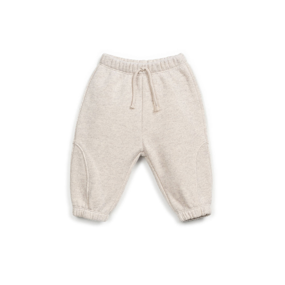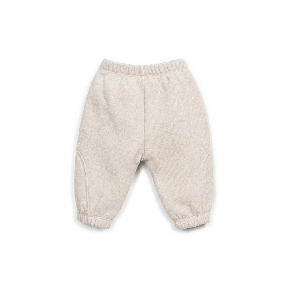 Pantalone jogger in cotone felpato color gesso. Elastico in vita e finta coulisse sul davanti con cordoncino. Elastico alle caviglie e cuciture decorative sul fondo. Un pantalone morbido e caldo, che Les Bulles ha pensato per i giorni più freddi. Play Up, azienda attenta all'ecosostenibilità, utilizza in parte fibre riciclate. 74% cotone, 13% cotone riciclato, 13% poliestere riciclato. Made in Portogallo