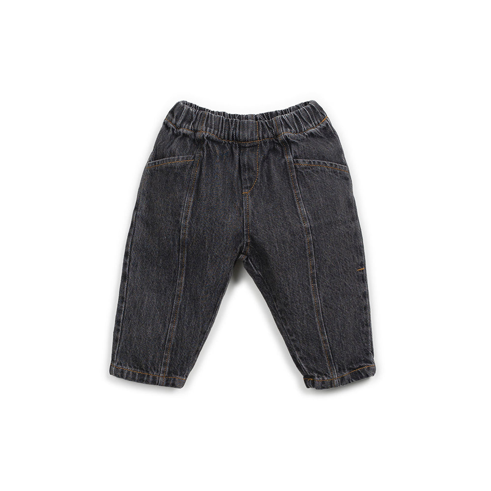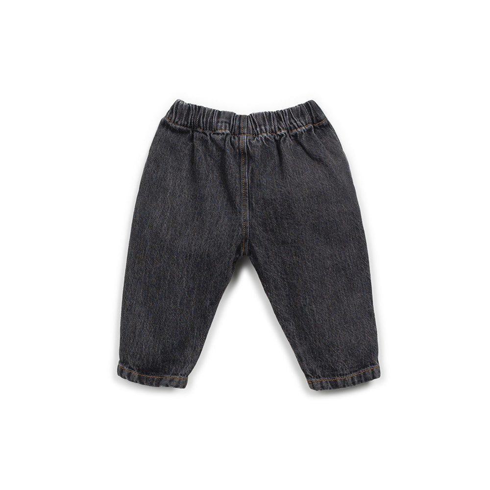 Pantalone lungo in denim di cotone con lavaggio nero. Elastico in vita, finta patta sul davanti e tasche a taglio frontali. Cuciture a contrasto. Vestibilità morbida e fit largo. Play Up è un'azienda molto attenta all'ambiente e per la tintura di questo jeans utilizza un candeggiante enzimatico che rispetta l'ambiente e la pelle del bambino. Scopri la selezione baby di Les Bulles! 100% cotone. Made in Portogallo