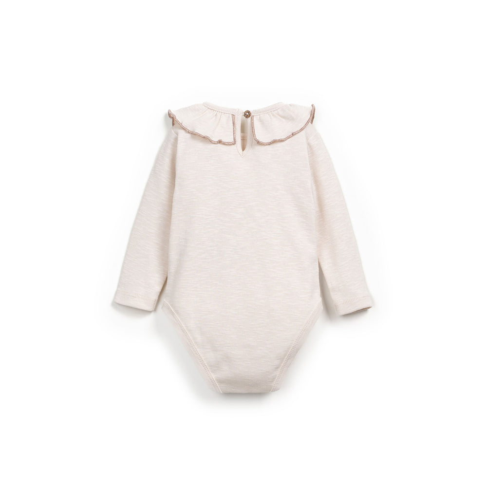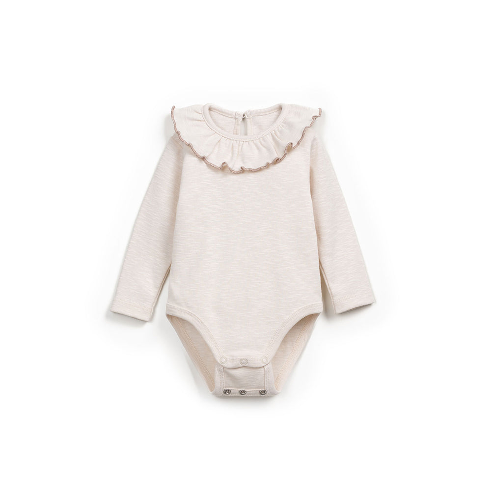 Body a manica lunga in jersey di cotone organico color gesso, con effetto malfilato. Colletto arricciato dello stesso colore con profilo a contrasto in beige. Apertura sul retro a goccia con bottoncino in cocco e sul cavallo con bottoni automatici (doppia regolazione sul cavallo per permettere alla bambina di utilizzarlo più a lungo). Questo comodo body Play Up possiede la certificazione GOTS, che lo dichiara prodotto con fibre organiche e rispettoso dell'ambiente. Disponibile da Les Bulles anche in rosa. 100% cotone organico. Made in Portogallo