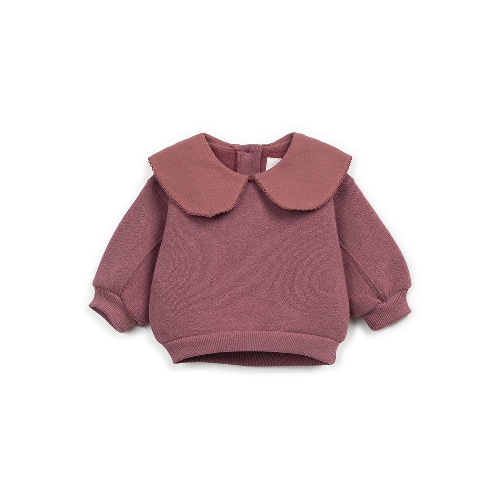 Felpa a manica lunga in morbidissima felpa invernale color vino. Colletto in garza di cotone dello stesso colore, con profili ricamati. Apertura sul retro con bottoni in cocco. Fondo e polsini a costine e cuciture decorative sulle maniche. Questa felpa è prodotta da Play Up con materiali riciclati, nel rispetto della natura. Disponibile da Les Bulles anche in color gesso. 74% cotone, 13% cotone riciclato, 13% poliestere. Made in Portogallo