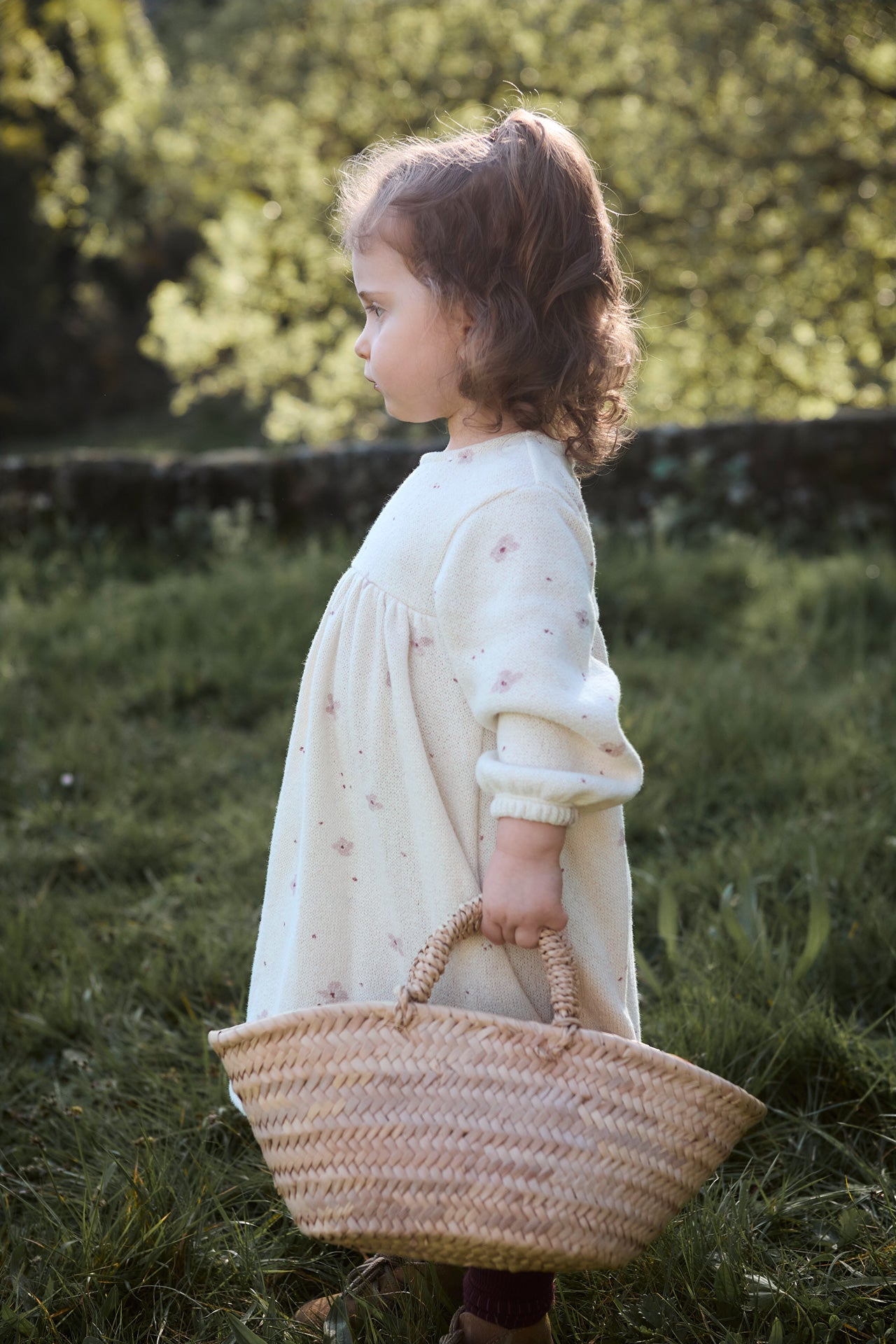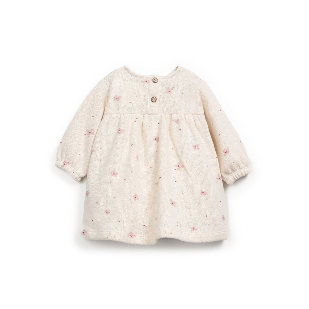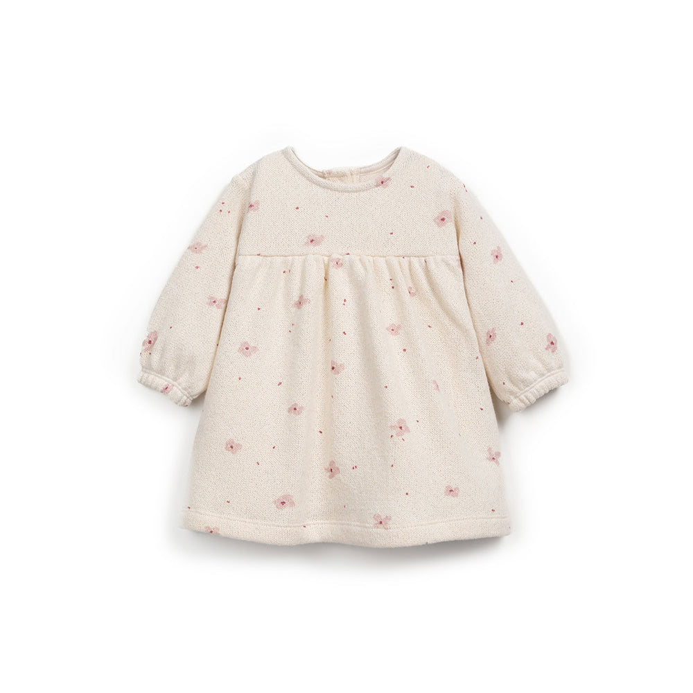 Abito girocollo a manica lunga in morbido caldo cotone color avorio, con stampa di fiorellini in rosa, con dettagli bordeaux. Arricciature al petto e apertura sul retro con due bottoncini in cocco. Elastico ai polsini. Un classico delle collezioni Play Up, pratico e versatile, prodotto con cotone rigenerato e riciclato. Disponibile da Les Bulles anche il completo maglia e pantalone con la stessa fantasia. 90% cotone rigenerato, 10% cotone riciclato. Made in Portogallo