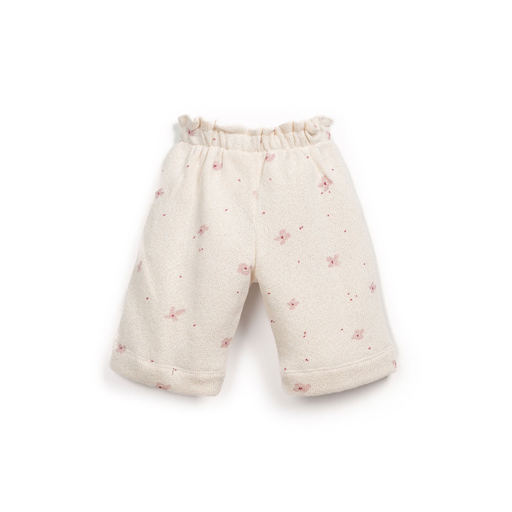 Pantalone lungo con taglio largo in morbido caldo cotone color avorio, con stampa di delicati fiorellini in rosa e bordeaux. Elastico in vita con arricciature. Questo pantalone bello e comodissimo, è prodotto con cotone rigenerato e riciclato: Play Up è un'azienda attenta all'ecosostenibilità e Les Bulles sostiene questo approccio alla moda rispettoso dell'ambiente. 90% cotone rigenerato, 10% cotone riciclato. Made in Portogallo