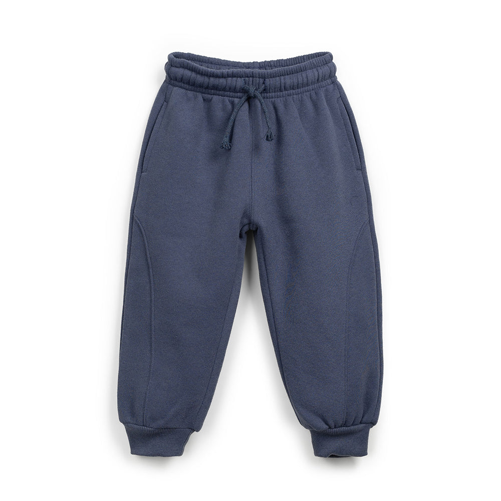 Pantalone jogger in cotone felpato color blu carta da zucchero. Elastico in vita e coulisse sul davanti con cordoncino tono su tono. Polsini a costine alle caviglie. Un pantalone morbido e caldo, che Les Bulles ha pensato per i giorni più freddi. Play Up, azienda attenta all'ecosostenibilità, utilizza in parte fibre riciclate. 74% cotone, 13% cotone riciclato, 13% poliestere riciclato. Made in Portogallo