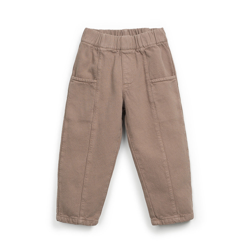 Pantalone lungo in twill di cotone color tortora. Elastico in vita. Cuciture decorative e tasche a taglio sul davanti e vestibilità morbida. Un pantalone che Les Bulles consiglia anche per i più vivaci, dato il modello largo e morbido. Play Up utilizza per questo capo una tintura naturale, priva di sostanze chimiche e rispettosa dell'ambiente. 100% cotone. Made in Portogallo
