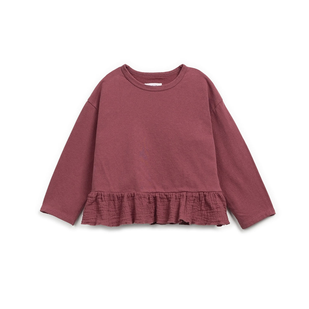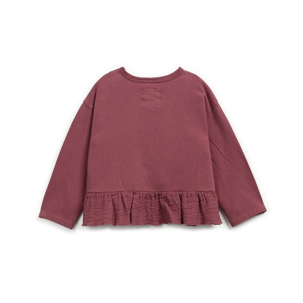 T-shirt girocollo a manica lunga in jersey di cotone organico color vino. Balza con arricciature in garza di cotone sul fondo. Questa utilissima t-shirt Play Up, che non può mancare nelle selezioni di Les Bulles, è prodotta con cotone biologico e possiede anche la certificazione Global Recycled Standard. 40% cotone organico, 40% cotone riciclato, 20% cotone. Made in Portogallo