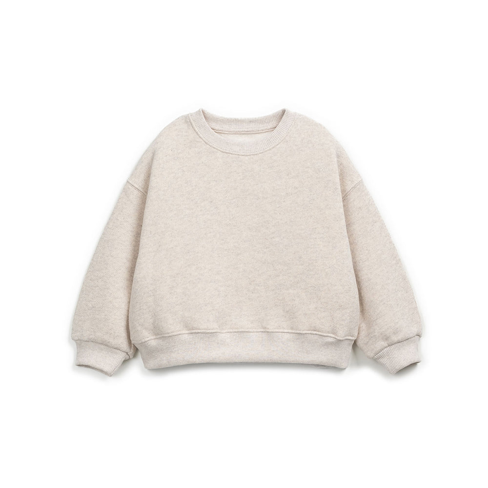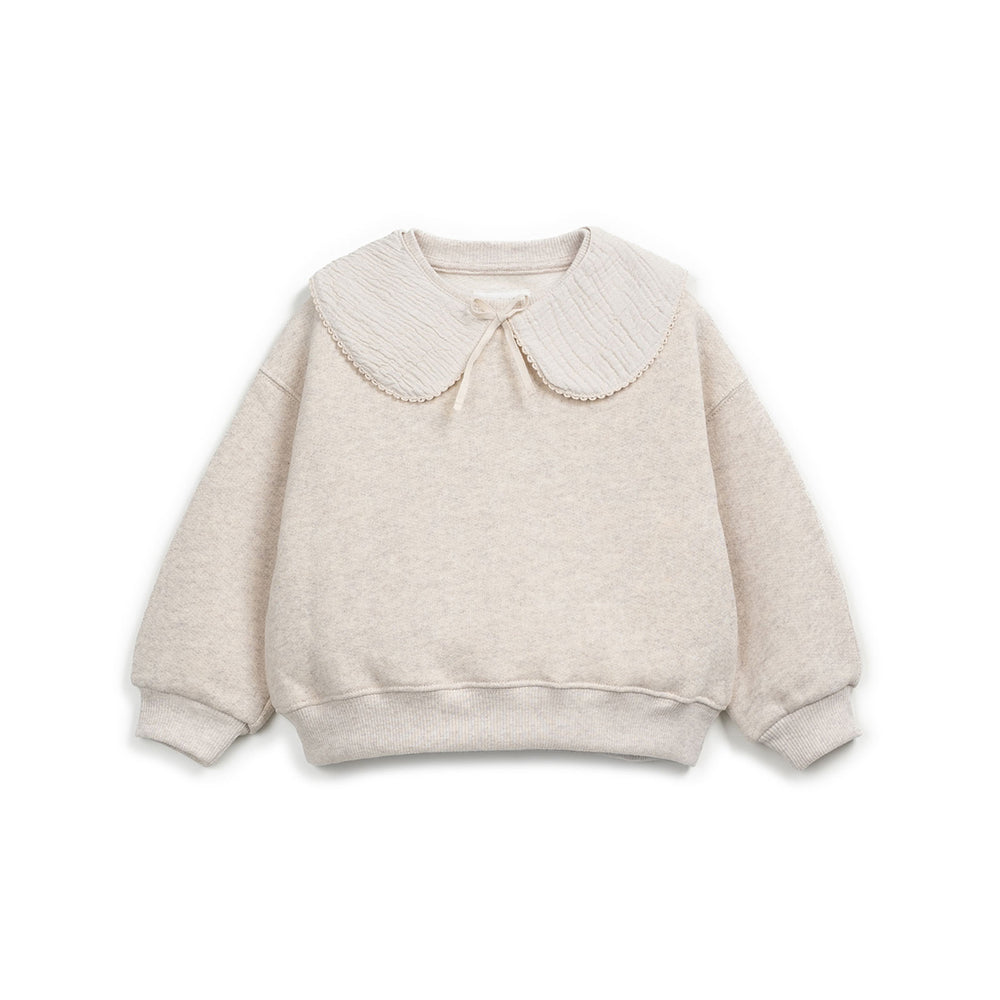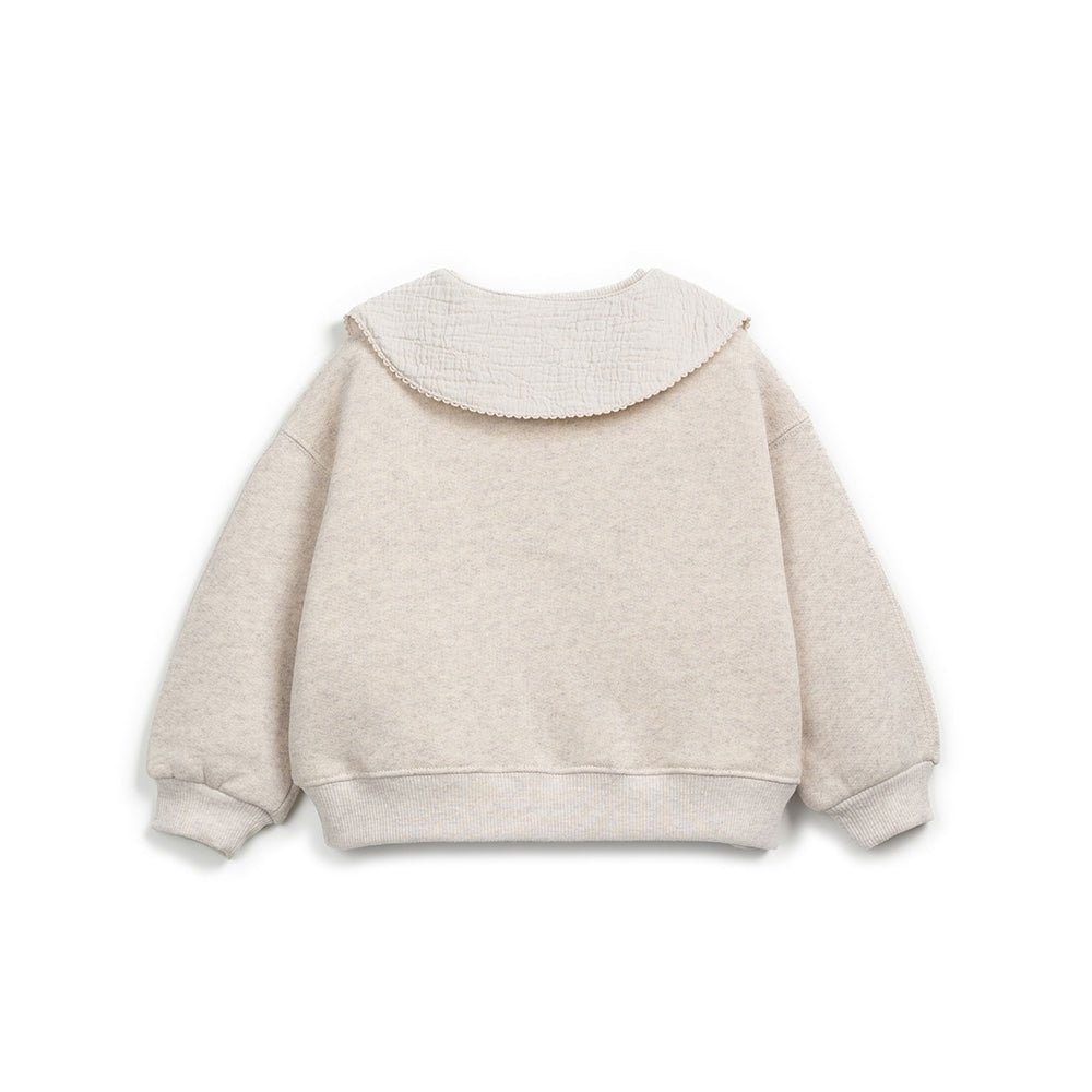 Felpa a manica lunga in morbidissima felpa invernale color gesso. Colletto in garza di cotone dello stesso colore, con profili ricamati e laccetto che si chiude sul davani, staccato dalla felpa in modo da poter essere riutilizzato anche su altri capi. Fondo, collo e polsini a costine . Questa felpa è prodotta da Play Up con materiali riciclati, nel rispetto della natura. Disponibile da Les Bulles anche in color gesso. 74% cotone, 13% cotone riciclato, 13% poliestere. Made in Portogallo