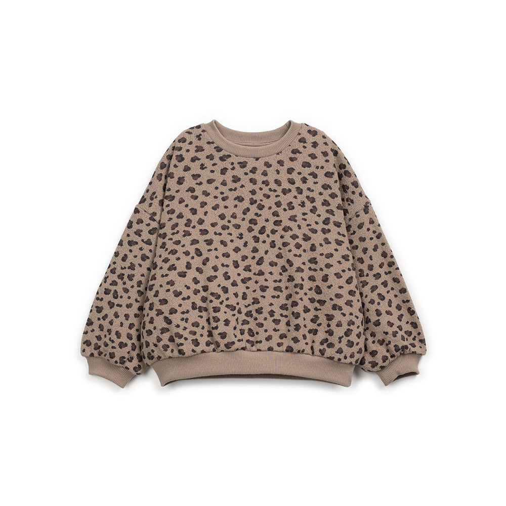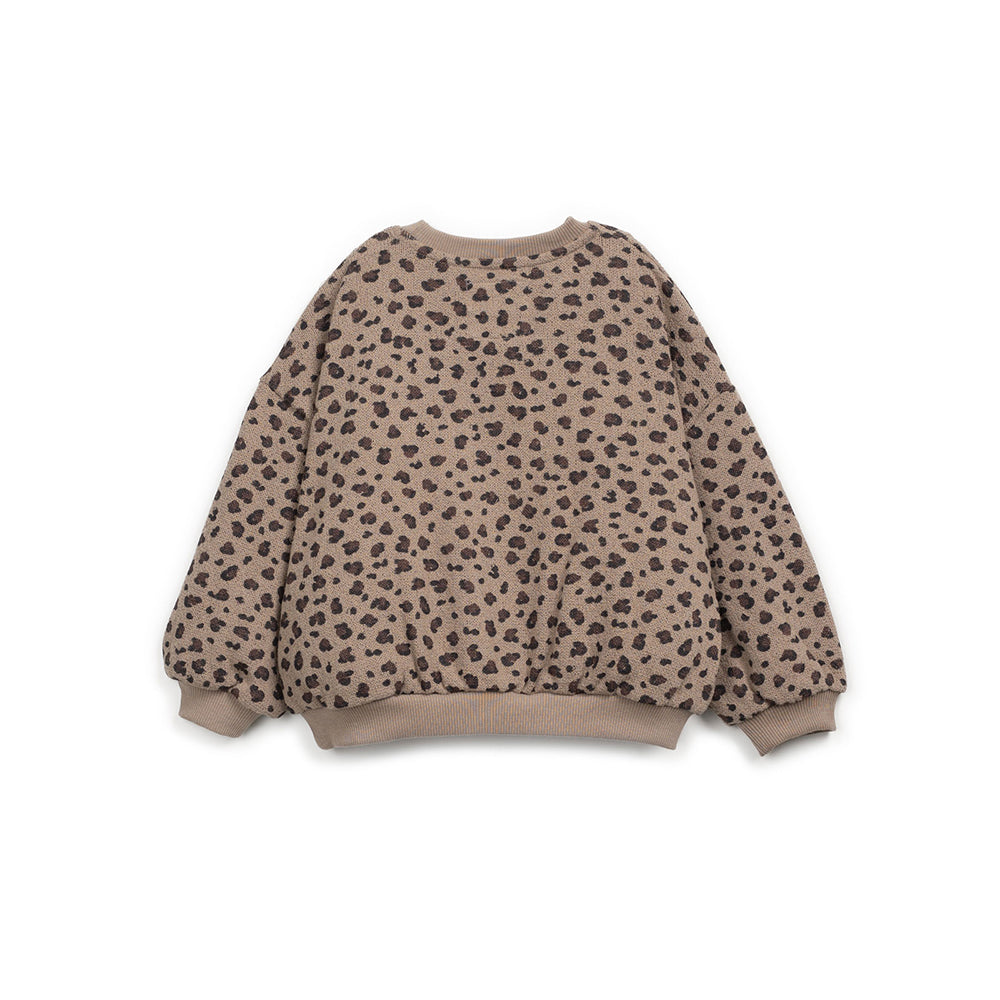 Maglia girocollo a manica lunga in morbido cotone caldo con fantasia animalier. Collo, polsini e fondo a costine in tinta unita. Spalla scesa e vestibilità abbondante. Una comodissima felpa, ideale per le bambine più trendy di Les Bulles che Play Up produce con cotone riciclato e rigenerato per limitare gli sprechi nel rispetto dell'ambiente. 90% cotone rigenerato, 10% cotone riciclato. Made in Portogallo