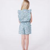Tuta corta girocollo e senza maniche in leggero popeline di cotone biologico verde salvia, con stampa di fiori in bianco. Apertura frontale con bottoni con logo Petit Bateau e rouches. Arricciature con elastico in vita e tasche laterali. Una simpatica tuta prodotta con cotone organico certificato Oeko-Tex Standard 100, ideale per l'estate di Les Bulles. 100% cotone organico. Made in Madagascar