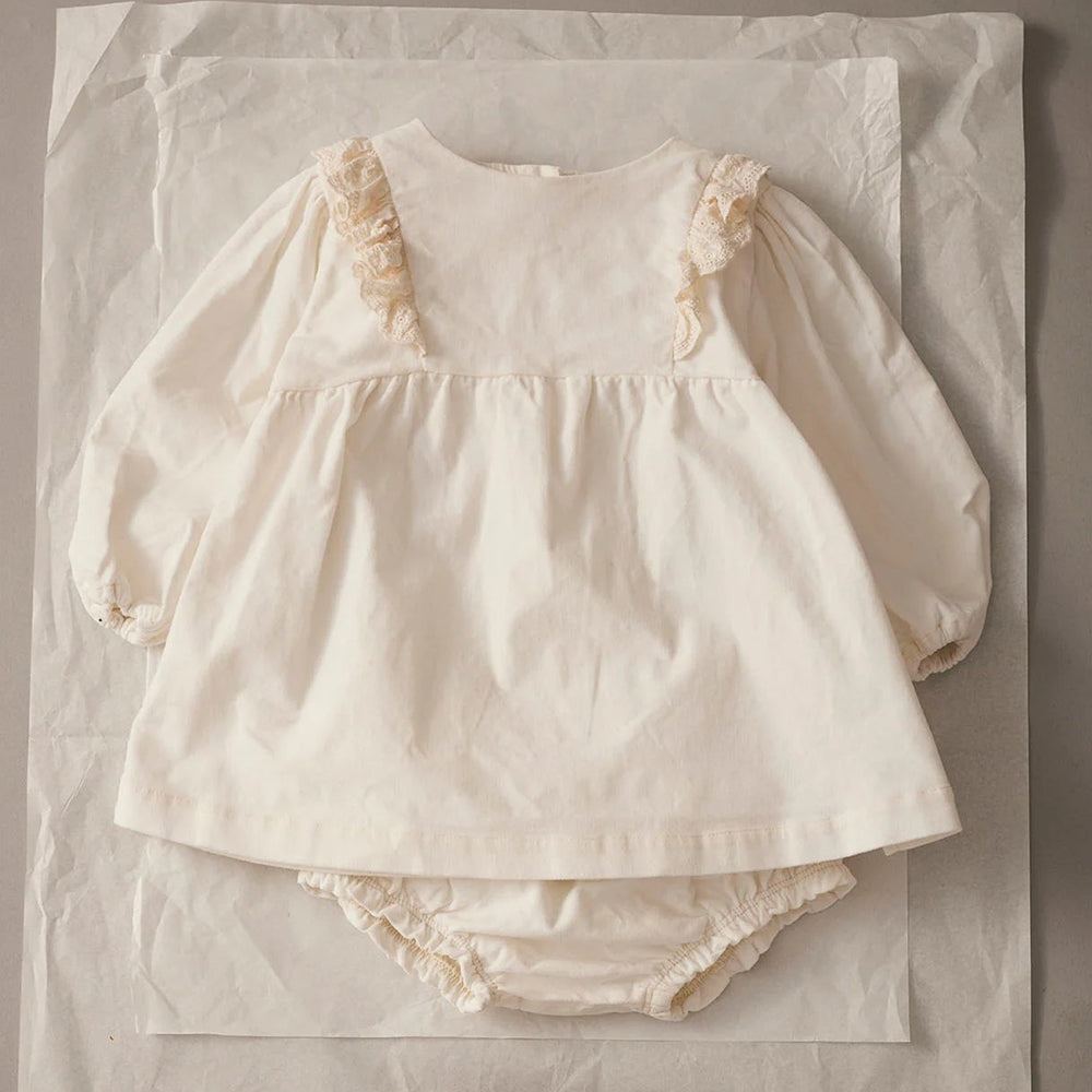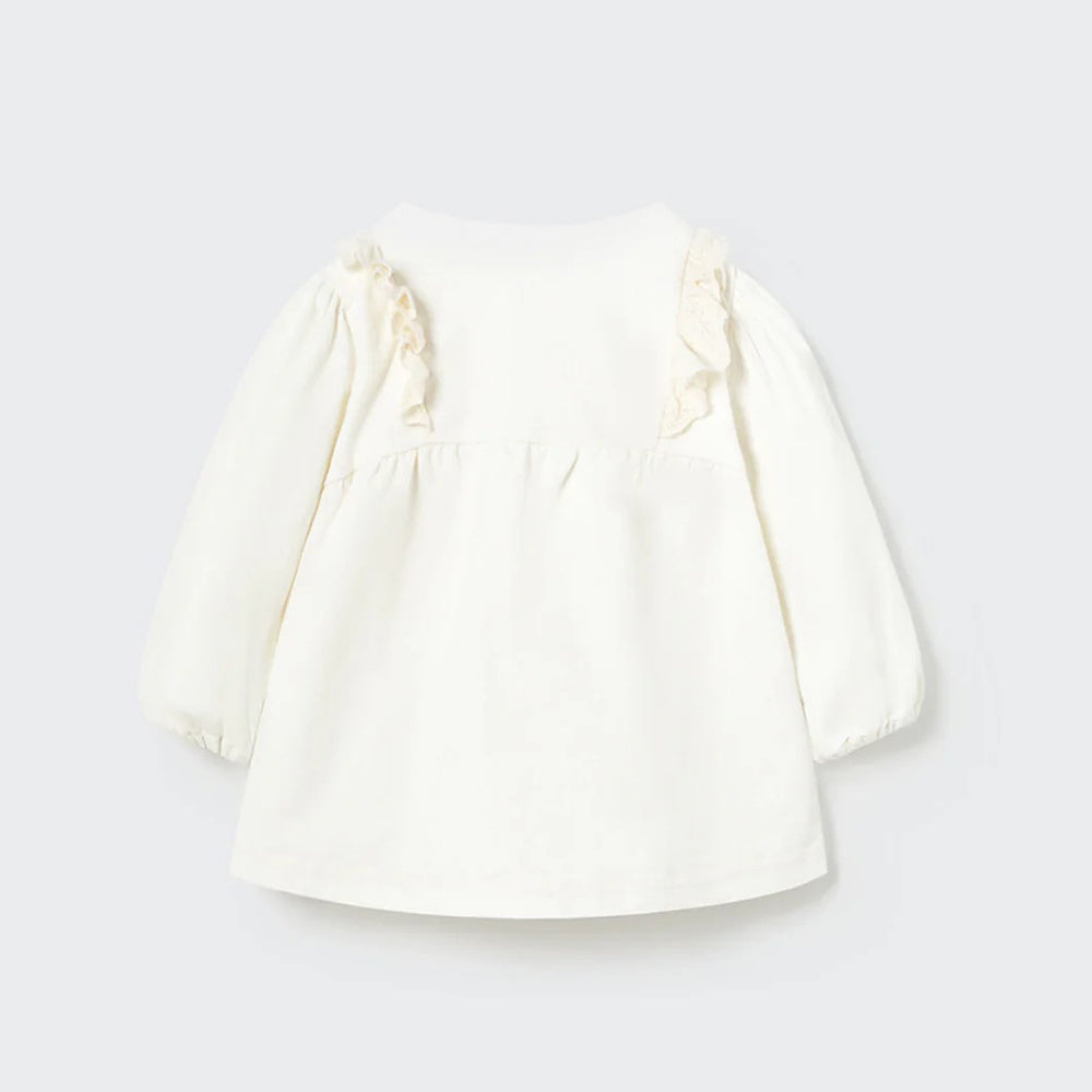 Abito girocollo con maniche lunghe in bellissimo velluto di cotone elasticizzato bianco. Arricciature al petto e volant in cotone ricamato sul giromanica. Spalle a palloncino e polsini con elastico. Apertura sul retro per tutta la lunghezza con bottoncini dorati a forma di cuore. Un abito Cozmo pensato da Les Bulles per le occasioni speciali e prodotto con cotone sostenibile. 98% cotone, 2% elastane. Made in Spagna